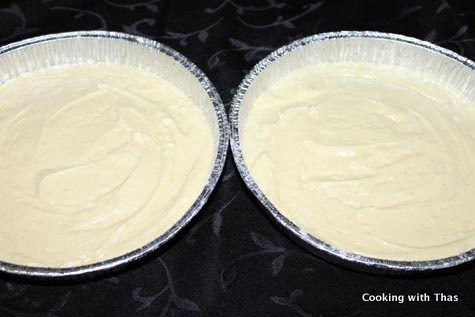 - Divide the batter evenly between the two pans and smooth the tops with a spatula.
