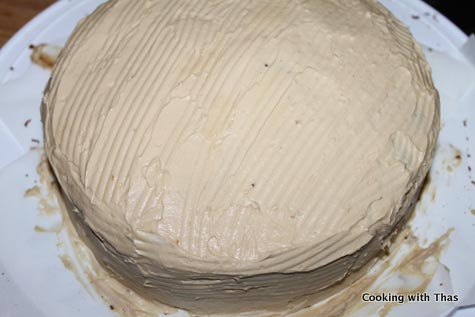 - Using a spatula, smooth the frosting around the sides of the cake and over the top.