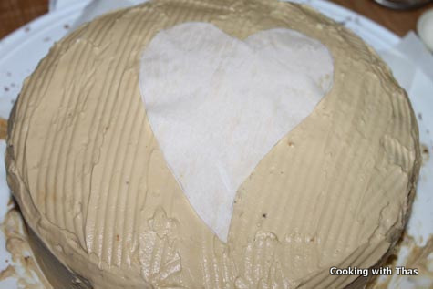 - To make the heart shape on the cake,I cut a heart shape out of parchment paper and gently placed it on the middle of the cake, sprinkle cocoa powder over the top of the cake.