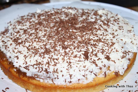 - Spread some of the mascarpone-whipped cream filling over the cake, about 1 cup and sprinkle the grated chocolate onto the filling.