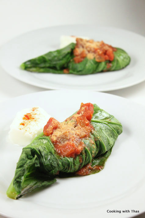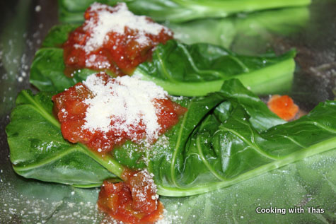 • Top each of the stuffed collard greens with salsa and sprinkle grated parmesan cheese on it.