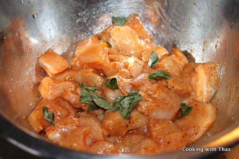 2. Marinate the chicken along with the above mentioned ingredients for marination, keep aside for 5 minutes.