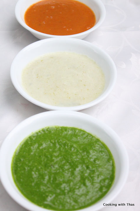 India celebrates its 64th Independence day today. I couldn’t be any happier and feeling so proud to be an Indian. While I was in the kitchen I was struck with the idea of making a tricolor chutney which represents Indian flag. Luckily, I had all the ingredients to make the three chutneys. For green color, I first thought of making cilantro chutney and ended up making spinach chutney. This was the first time I’ve tried making spinach chutney, it tasted pretty good. For white color, I made coconut chutney which is a popular chutney in my hometown which is often served with Dosa or Idli. And for red color, I made my favorite tomato chutney which is also served with Dosa, Idli and rice.