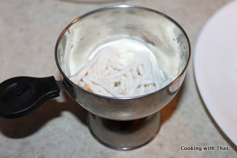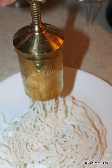 Well, you need an Idiyappam maker or seva nazhi and puttu maker to make this. In North America, some Indian stores might have this. Anyway, it’s a kool kitchen gadget to have.
