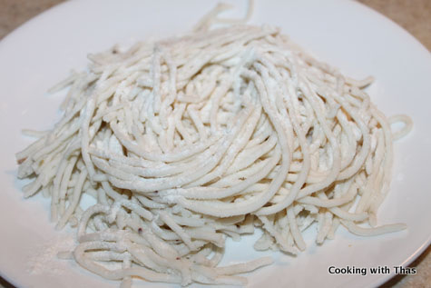 - Repeat this with the rest of the dough,make sure to sprinkle with rice flour otherwise the noodles will stick together.
