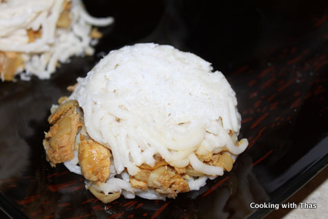 - Let it steam cook for about 3-4 minutes, remove it and gently turn the puttu maker upside down on a plate.