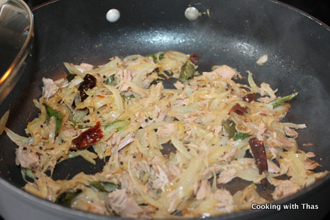 - Drain the water from the canned tuna, add the tuna to the cooked onions, cook for sometime.