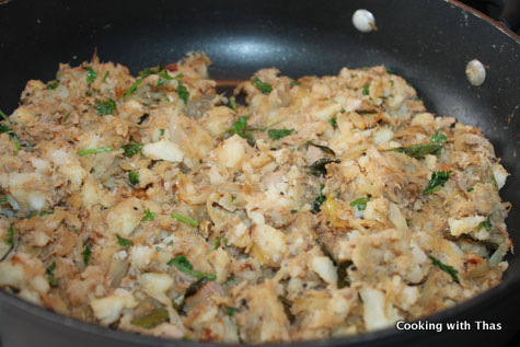 - Add the cooked potatoes, mash it using a wooden spoon without any lumps and combine it to the tuna mix.