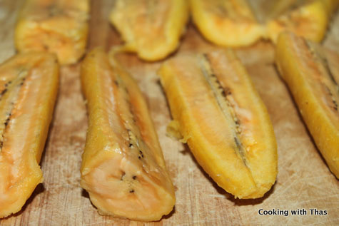 11. Peel off the skin, cut the plantain into two halves and remove the black seeds from the center.