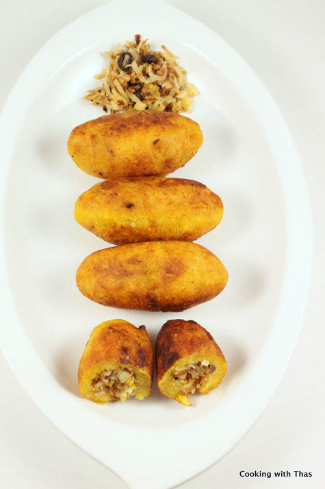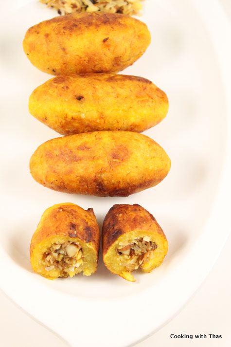 • Place the stuffed plantains in oil & deep fry till golden brown in color. Transfer to a plate.