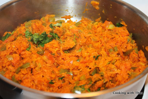 - Add grated carrot and little water to it, cook covered for a few minutes.
