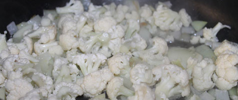 - Add cauliflower florets, ¼ cup water and cook covered till the veggies have turned tender.