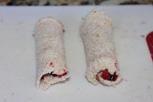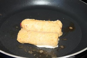 10. Dip the rolled up bread in egg mixture and place on the melted butter seam side down,
