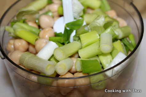 - To a food processor, add the chickpeas & other ingredients except green onions. Process to a coarse mixture, don’t make into a smooth paste.